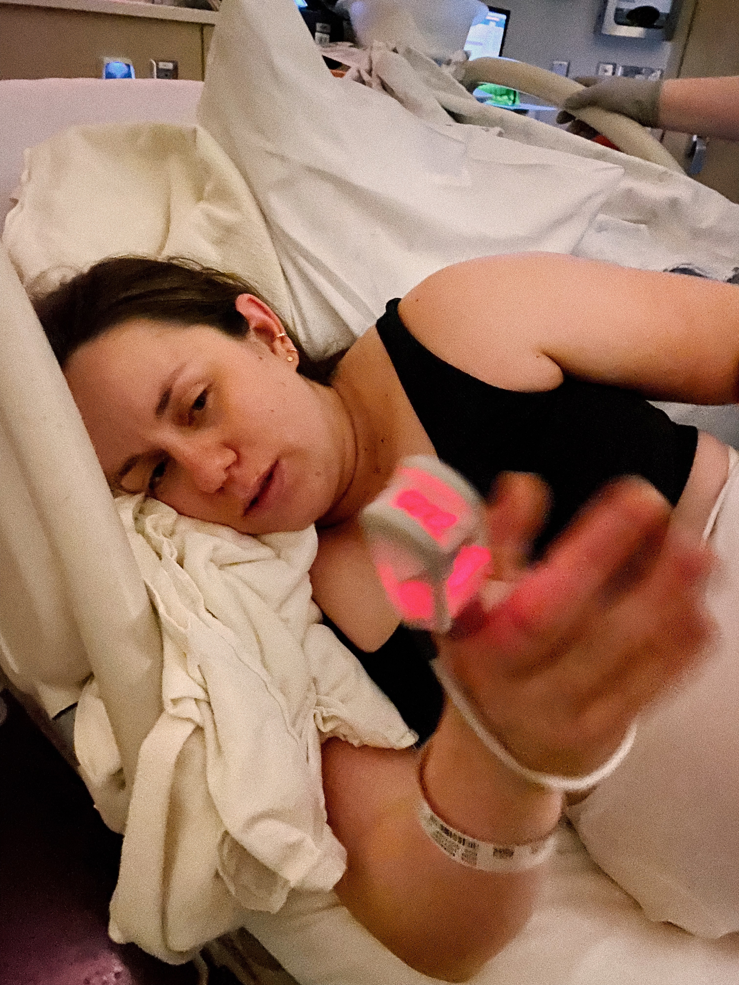 We finally got back to our room and I was so excited to get in the tub. I knew that would give me some relief. It was a little after midnight at this point. They told me I couldn't get in the tub until my covid results came back, which was so weird and annoying. So they got me on my side on the bed so they could get me hooked up to the fetal heart monitor. They were having such a hard time getting it to read the heart rate accurately. I was so out of it at this point. Everyone kept asking me questions and I would just ignore them. I was very limited to the positions I could be in because of the horrible back labor. At this point, I was not putting two and two together, that back labor meant the baby was facing the wrong way. I guess Dan was starting to get worried and even asked them what positions I could do to help that. They told him just whatever I was comfortable with. That part frustrates me. I was happy to know that our midwife Emily was there that night! We got so lucky to have her present for the whole thing.